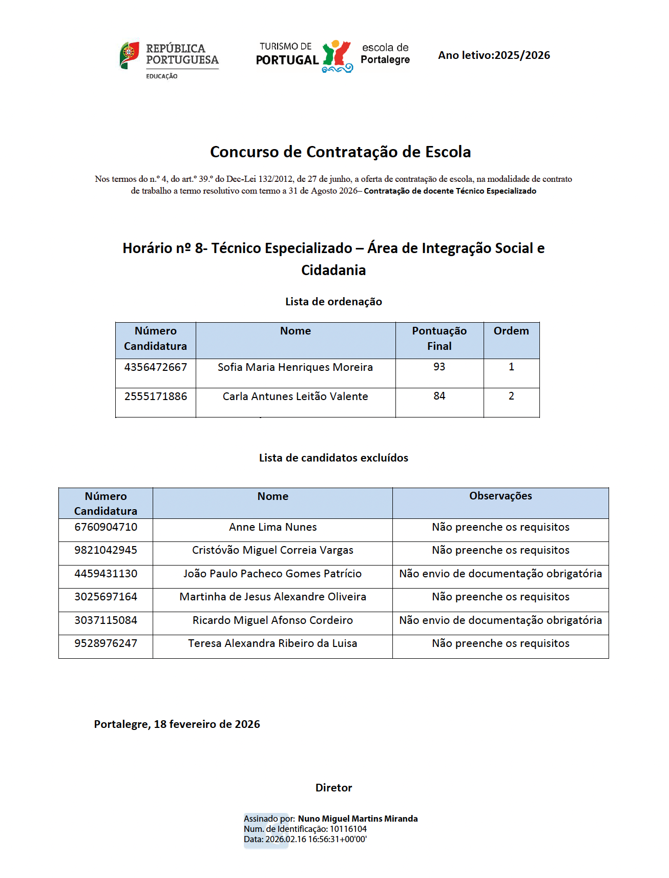 Concurso de Contratação Escola | Resultado Horário nº 8 Área de Integração Social e Cidadania