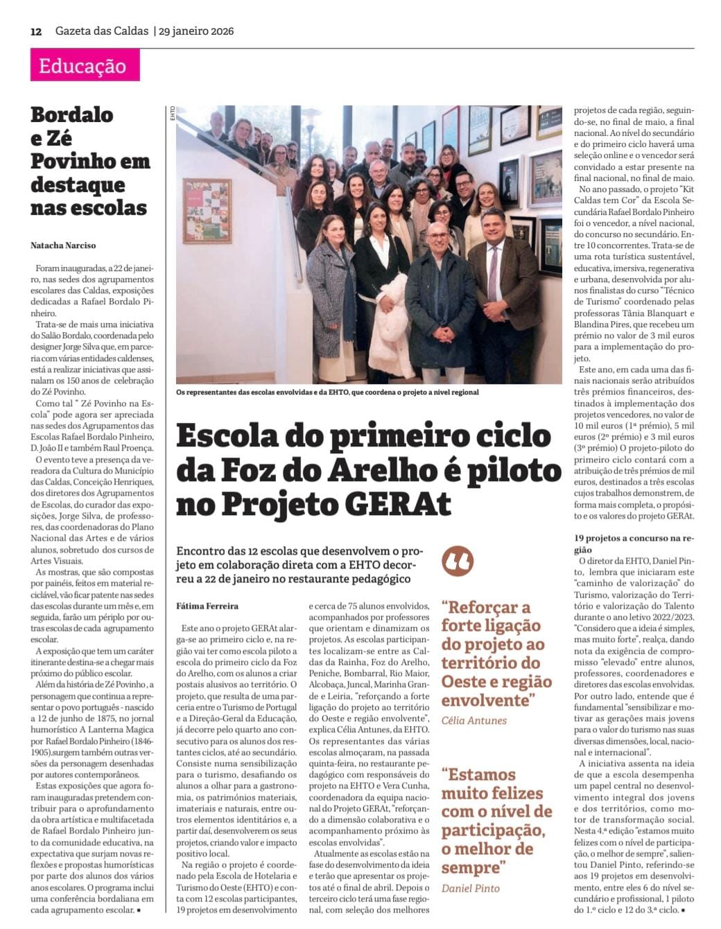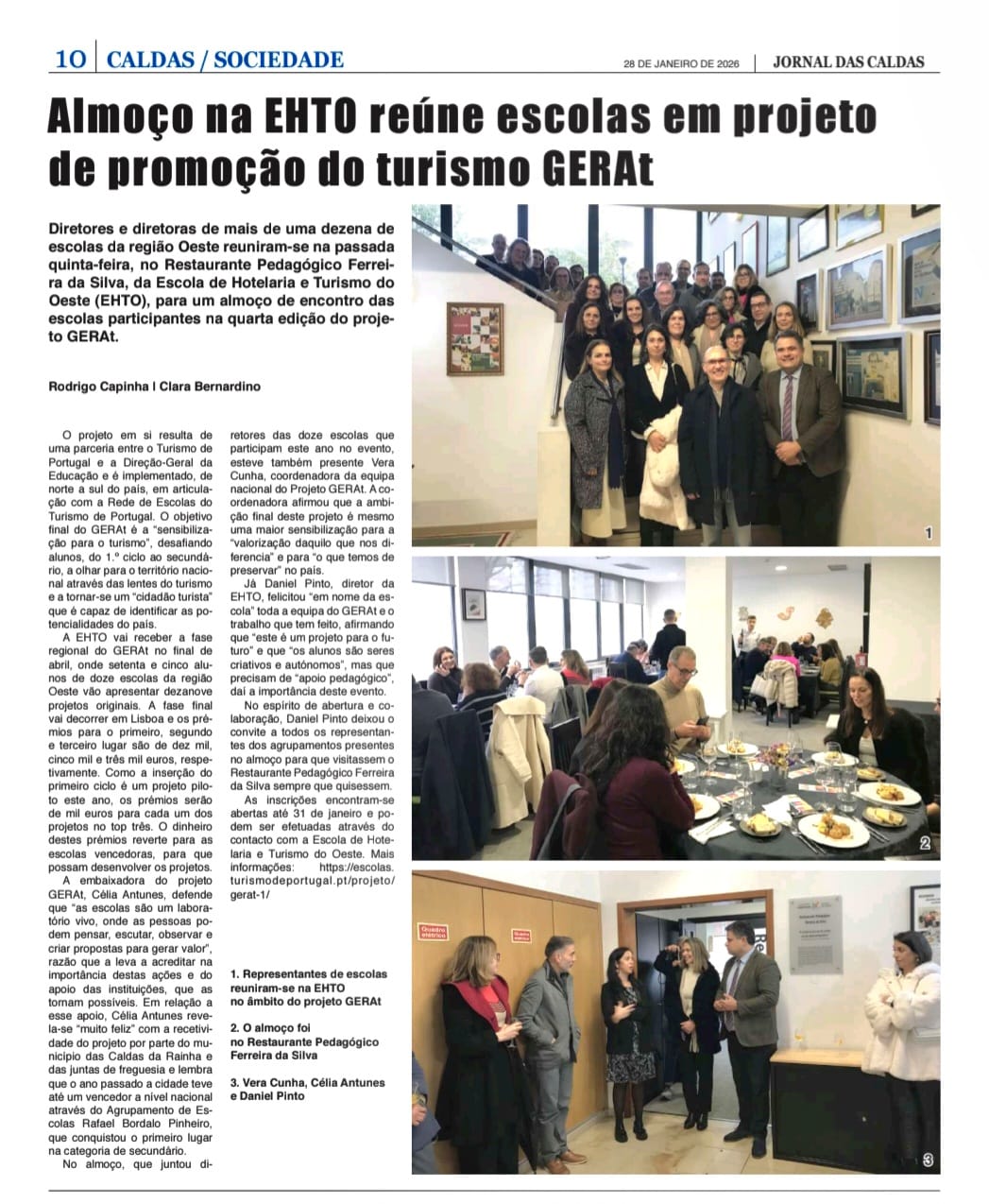 A Escola de Hotelaria e Turismo do Oeste (EHTO) acolheu, no passado dia 22 de janeiro, um encontro que reuniu representantes de 12 escolas da região Oeste envolvidas no Projeto GERAt, numa iniciativa que teve lugar no restaurante pedagógico Ferreira da Silva. O momento assinalou mais uma etapa da 4.ª edição do projeto, que continua a afirmar-se como uma referência na promoção do turismo educativo e da valorização do território.