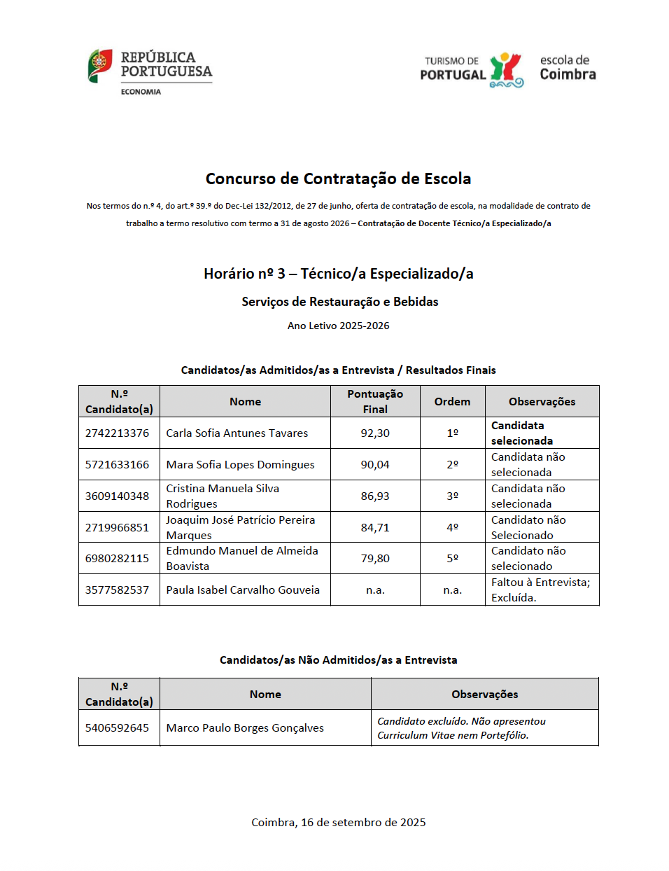 Escola de Hotelaria e Turismo de Coimbra Resultado do Concurso de Técnicos Especializados