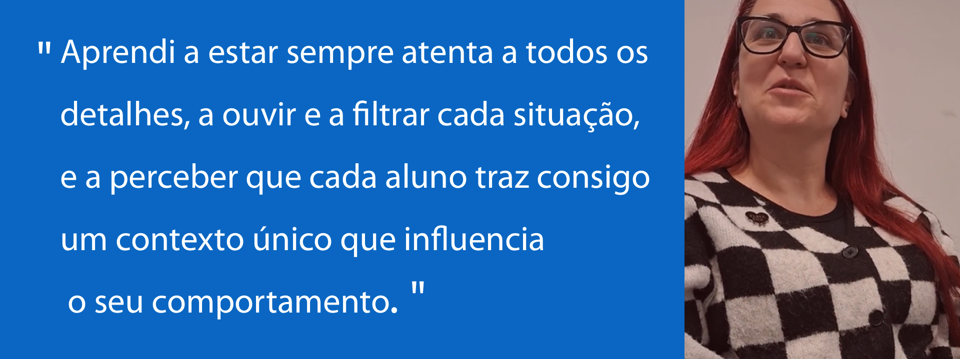 Aprendi a estar sempre atenta a todos os detalhes, a ouvir e a filtrar cada situação, e a perceber que cada aluno traz consigo um contexto único que influencia o seu comportamento.